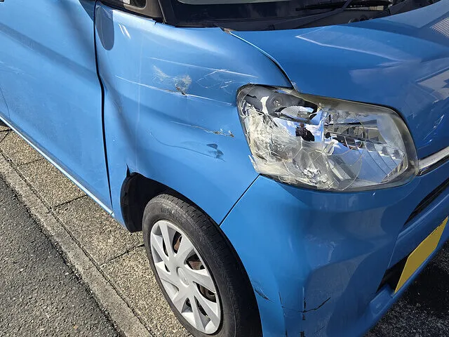 損傷箇所は、フロントフェンダーからフロントドア、バンパー、ヘッドライト周辺にかけて。