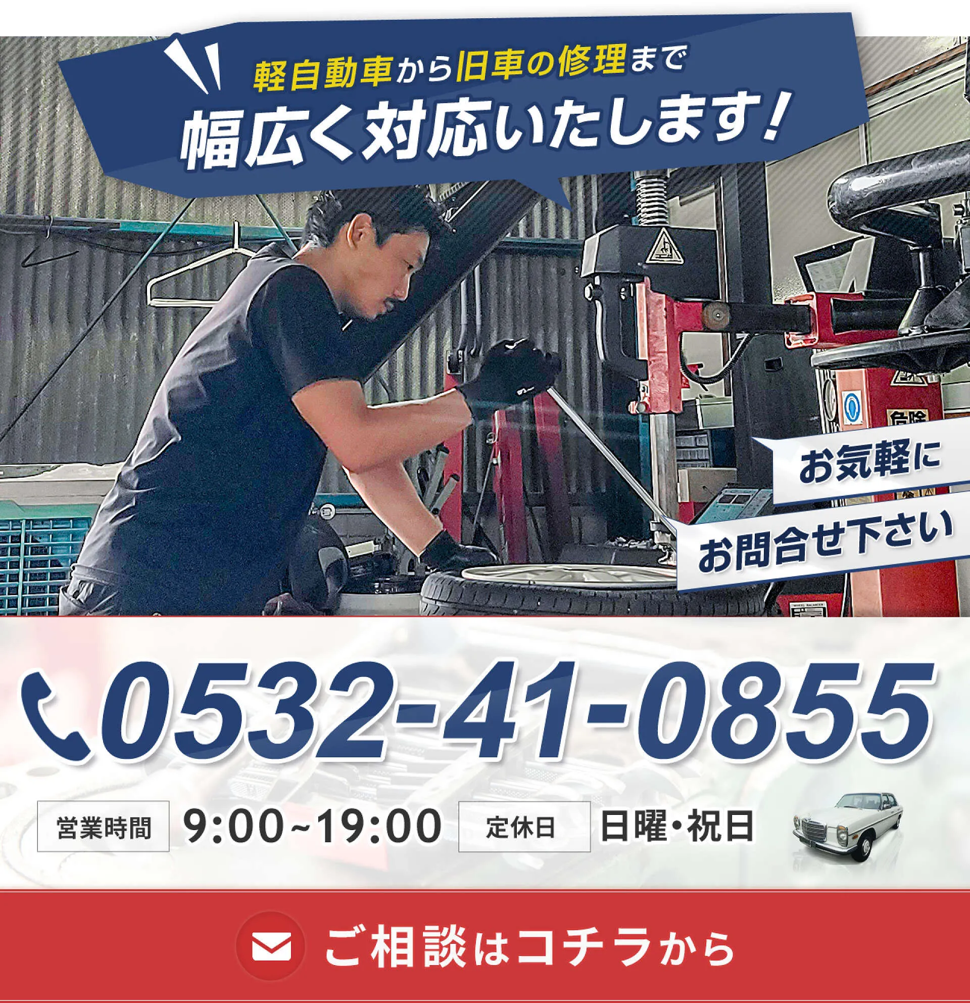 豊橋市で対応率90%以上、国産車・輸入車問わず安心してお任せいただけます。