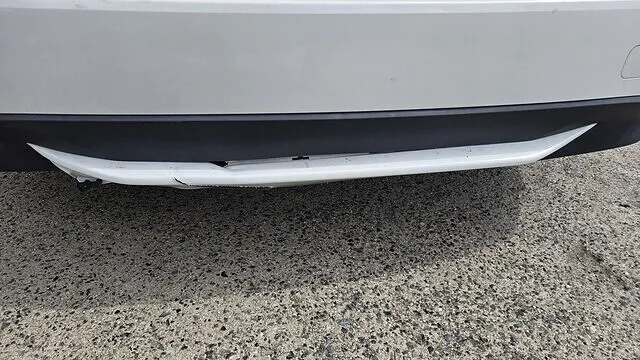 ご入庫時の状態を確認すると、リアバンパー下部に大きなへこみと変形が見られ、樹脂部分の割れや固定部のズレも発生している状態。