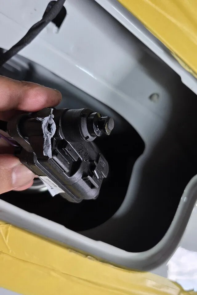 本来、ドアロックの開閉に連動して作動する部品ですが、経年劣化によりモーターや可動部が正常に動かなくなり、給油口が解除されない状態になっていました。