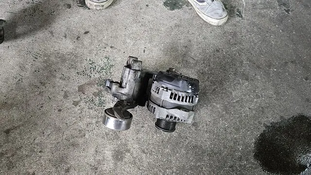 写真の通り、取り外したオルタネーターとテンショナーは経年劣化が見られる状態。